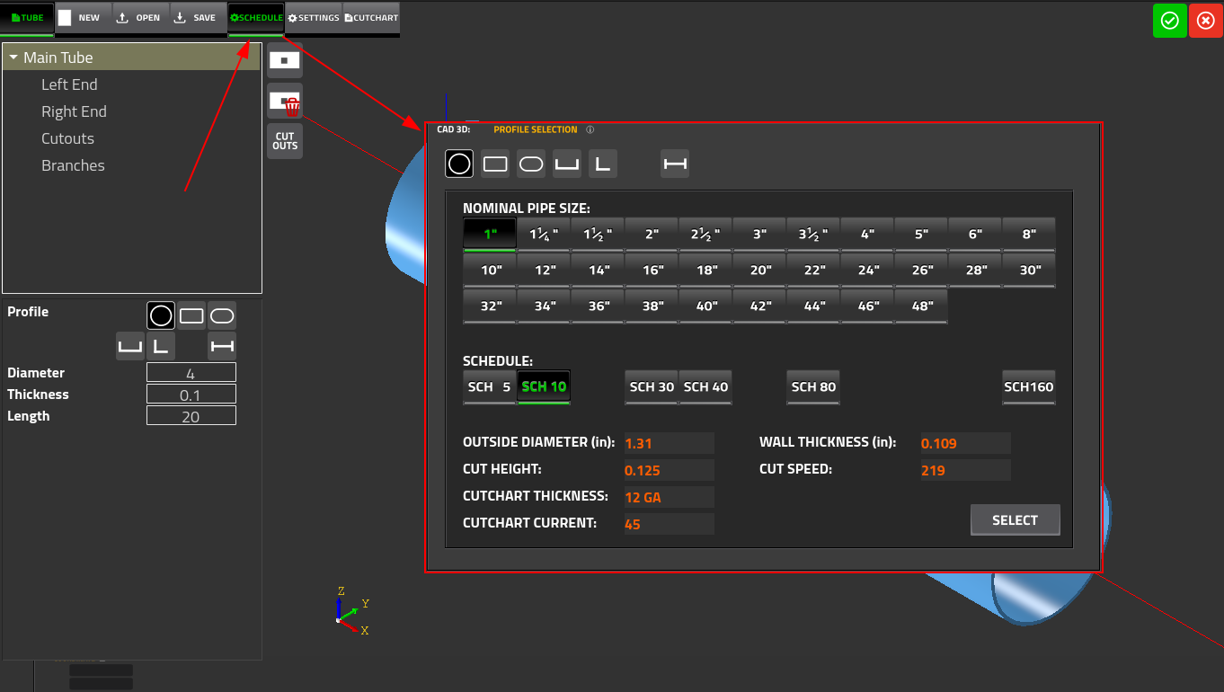 - Schedule - allows the user to pick from a variety of profiles, select the nominal pipe size, and select from a list of standard pipe schedules